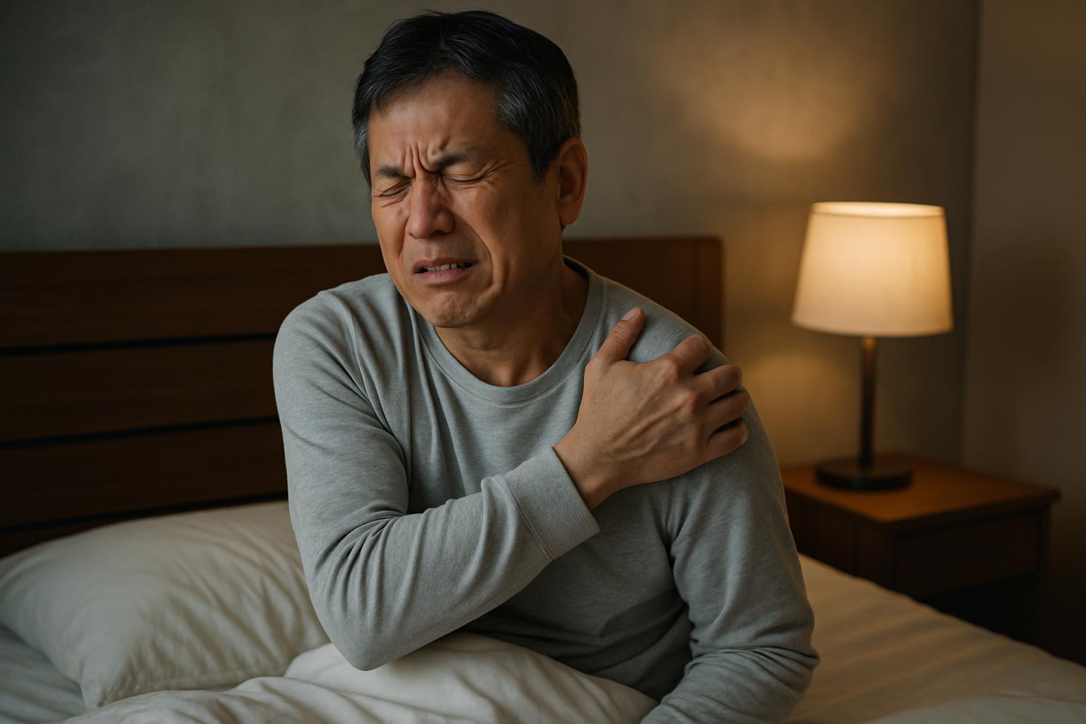 うつ伏せや、腕を頭の下に入れる姿勢(腕枕)は肩前方組織を圧迫して痛みを助長するため避けましょう。入眠前の短時間の温熱(ホットタオル)や、必要に応じた鎮痛薬の就寝前内服は睡眠の質を高めます。
