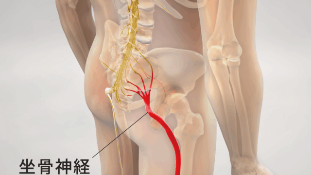 坐骨神経は、腰椎の第4番・第5番(L4・L5)と仙骨の第1番から第3番(S1・S2・S3)の神経根が束になって構成されています。これらの神経根は脊柱管という骨の管を通って脊髄から枝分かれし、骨盤の中で合流して太い坐骨神経を形成します。